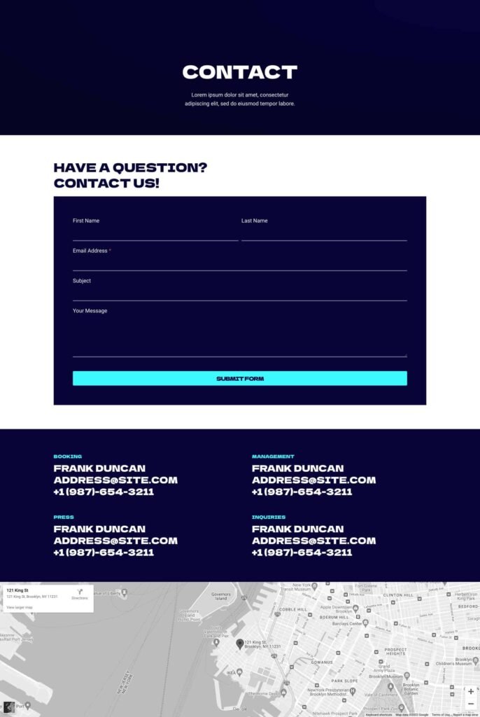 Contact Contact Lorem ipsum dolor sit amet, consectetur adipiscing elit, sed do eiusmod tempor labore. Have a question?Contact Us! First NameLast NameEmail Address*SubjectYour MessageEmailSubmit Form Please enable JavaScript in your browser to submit the form Booking Frank Duncanaddress@site.com+1 (987)-654-3211 Press Frank Duncanaddress@site.com+1 (987)-654-3211 Management Frank Duncanaddress@site.com+1 (987)-654-3211 Inquiries Frank Duncanaddress@site.com+1 (987)-654-3211